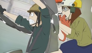 Although I immediately found the character designs to be disagreeable, two signs of potential did show early on: the overly-elaborate designs of both the apartment complex that Midori lives in and her later school and the clear homage being made to Hayao Miyazaki's Future Boy Conan in the anime which inspired her. In fact, nods to Miyazaki's works are a recurring theme throughout the episode, whether it's an opening shot of young Midori in a car reminiscent of the opening of Spirited Away or design aspects of later action scenes which have the feel of a number of his movies. The main characters are also appreciable; both Midori and Tsubame display genuine passions for their interests, and while Kanamori may claim that she's just in it for the (potential) money, she conveys the sense that she is actually going along with the whole thing because it entertains her, especially including the way that Midori and Tsubame start bouncing ideas off each other. The dialog exchanges here also seem less calculated and more free-flowing than normal, but that has been a hallmark of some of Yuasa's past works so that's no surprise.