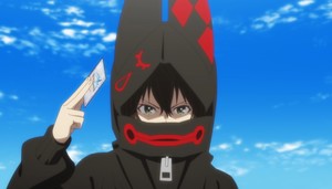 Instead, the rest of the premiere consists of Sakura teaching Teruto how to play Build-Divide. No, really, that's it. Sakura explains the decks' card limits, what territory cards do, how to activate different card types and keep track of health points; the works! They play the game. Teruto does some super badass hero guy card plays, which somehow result in him wearing one of the Top 3 Goofiest Outfits I have ever seen this side of a Tetsuya Nomura joint. Teruto wins. Sakura is impressed. That's the episode.