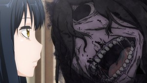 After that, it's all gross-looking ghosts trying to get Miko's attention as she does her best to pretend she doesn't see them. This wasn't particularly scary so much as mildly amusing — it's the kind of thing you do when a small child is misbehaving for the sake of getting you to pay attention to them. They're decently gross-looking, reminiscent of the famously horrifying illustrations of the Scary Stories to Tell in the Dark children's books. Undoubtedly it didn't work in the episode's favor that I already read the manga and didn't care for it.