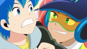 To say that this is weird may be to understate. The first three-quarters of the episode spend most of their time leaning into the wackiness, which can make it feel like a bit of a trial to get through; in fact, I was going to give this a 2 until Muteki's transformation, because it felt too much like the episode was working too hard to be zany. Evil corporate overlord Theo Eight, owner of OctinQ, which you can see as analogous to the evil tech corporation of your choice, would be twirling his mustaches if he had them, the colors are Playmobil-bright...everything is just a little too much. It does all come together once the main action gets going though, and this could turn out to be a lot of fun if it can maybe dial the setting and DJ down a little. (And if we never see waitress Aida again, I'll be very happy.) It's definitely worth giving a chance, because I really do think this is going to be one of those shows that either tickles your funny bone or sends you screaming out of the room with few people falling in the middle.