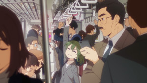 That's kind of inevitable when your romcom's entire premise is “he tol, she smol” and nothing else. That's a joke that works for a 4-panel gag comic that gets shared around on Twitter, but it cannot sustain even half an episode of television, and sticking within that stricture for that long proves to be an albatross around Senpai's neck. The first half of this episode moves by at a snail's pace as we watch increasingly tedious jokes about Futaba's height and how gosh, everyone sure does treat her like a kid, especially her super tall coworker who sure is loud! There's not really gags, outside of short (heh) bits like Futaba struggling to grip the handles on the subway, and even our titular annoying senpai isn't really annoying so much as he's condescending, treating Futaba like a child, as if this was a stealth Take Your Daughter to Work Day series instead.