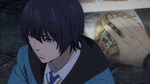 But then the episode keeps going, leaning straight into bullshit philosophy about how if devils exist, it is only in the heart of man and other varieties of edgy nihilism. It's weird that his second power is to make people fall obsessively in love with him; straight-up mind control would be easier to implement and carry way less baggage. He makes his aunt fall in love with him to learn the truth of what happened to his family and little brother, and then she kills herself out of guilt with a knife. Blood sprays all over the room, and the camera luridly zooms in first on her barely-clad butt and then her corpse's agony-contorted face. Which it goes back to several more times. I didn't count but it was at least five. Oh, and Mirai implies that stealing a 150-yen melon bread is comparable to blowing up a family for the sake of murder. It's ridiculous.