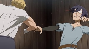 I was aware of what the twist was going to be even before the opening narration spelled it out, that Kiwame was the almost mythically off-putting immersive RPG that forces its players to explore a world still bound by realistic rules and the limitations of their real-world bodies. The joy of what happens to Hiro in the oddly-named starting village of Ted isn't in discovering this turn of events, but in the show's willingness to escalate its skewering of RPG tropes to hilariously grim heights. Hiro is shocked to discover how realistic and immersive the 10-year-old game is at first, and even more shocked to discover that the two childhood-friend NPCs react so violently to his simple attempt to leave the village and start the main quest. He doesn't just end up pissing them off – he accidentally skewers his buddy through the skull with a knife, which seems to permanently drive the guy's sister into a bloodthirsty rage. One can only hope that thread is followed up on soon enough.