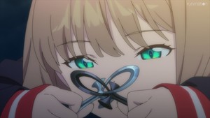 In this first episode of Dynazenon, we're treated to a series of vignettes that introduce a cast with no immediate connection to one another. Yomogi is a young man who works part-time to scrape together some spending money, though he seems to have a tenuous relationship with his mother and the new guy she's been seeing (Yomogi's response to receiving a “Welcome to High School” gift from the guy is to immediately toss it in a donation box). Meanwhile, Yume is obviously struggling to cope with the breakdown of her family in the wake of her older sister's death; there are rumors abound that she has picked up a habit of repeatedly asking boys out only to ditch them without a second thought, and Yomogi discovers that there is truth behind all of the gossip when she does the same to him. In another part of town, two cousins apparently live as shut-ins, surrounded by clutter and pop-culture detritus as the world becomes exceedingly stranger outside. Elsewhere, a trashcan suddenly decides to defy all known laws of gravity and float into the sky. Mysterious, glistening shards have been scattered all about.