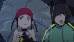 Set in the same universe as SSSS.Gridman, SSSS.Dynazenon's first episode is an experience. In part this is because rather than the four S's standing for “Superhuman Samurai Syber-Squad,” it looks as if they're meant to be “Scared Souls Shine like Stars,” so there's more of an interest in keeping the characters off- balance. That mostly applies to Yomogi and Yume in this episode, two high school first years who appear to be going through some stuff. For Yomogi, the implication is that his mother's dating someone he doesn't care for, while Yume seems to have an obsession with making dates and then standing the person up. What either of these things will have to do with the fact that they've essentially been press- ganged into mecha piloting service remains to be seen.