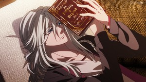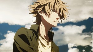 Meanwhile, Eiji's got a crew known as Helios (sun, associated with the Greek god Apollo) which is fighting against a mafia that goes by Dusk (you know, in opposition to the sun) while there's another gang of Scard called Artemis (who is the twin sister of Apollo, and thus will probably ally with Helios). Kai has a not-brother named Minato who apparently mostly sits in their ludicrously posh slum apartment while Helios runs a far-too-ritzy-for-B1 café, and there's also law enforcement just being…there. There's also a kid who may or may not be in need of rescue whose main purpose appears to be to facilitate the initial meeting of Eiji and Kai. It's all a jumble of pretty men with weirdly immobile faces shooting at each other or trading bons mots against photo-realistic backgrounds. I'm not entirely sure where it's going or why.
