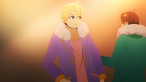 The latter is arguably one of the best parts of the episode and the source manga; male idol Yuya Niyodo's utter disdain for his profession has made him both the despair of his manager and something of a legend with his fans. One half of the duo ZINGS, Yuya stands in sharp, amusing contrast to his partner Kazuki, who is everything a male idol should be: cute, perky, and enthusiastic. Yuya, on the other hand, does things like forget the lyrics to his own song and hold the microphone out to the audience. The contradiction between the two guys isn't working for their manager, but since Kazuki refuses to go solo, well, there's a sense that her frustrated rage has no where to go. (She threatens to fire him, but I'm not sure that she can.) But wait, there's more gap moe! Because when Yuya is inexplicably able to see the ghost of a perky girl idol named Asahi who died a year ago, they learn that she can take over his body and do his performances…so now he's gone from expressionless monolith to hyper-perky and super cute, tossing out “bang” hand gestures with abandon and short-circuiting the fans' brains. It's layering contradiction atop contradiction for ZINGS' audiences, and for us there's something just really entertaining about how chill Yuya turns out to be about letting some random girl ghost take over his body once he figures out how he can use it to his advantage.