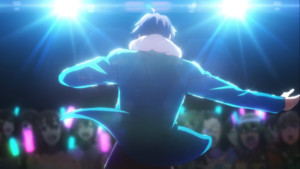 But then again, there was that dancing. The CG idol anime use for their musical sequences has come a long way in the past decade or so, and Phantom of the Idol rockets right back to the early 10s'. It's stiff and plasticky, and Yuya and his partner do about three moves in their ugly, poorly-fitting outfits that look like someone basted airplane neck pillows onto their street clothes. The background is an empty stage with a few lights. The cheapness in their costumes and staging could stem from them being a low-level group… but then again, they had filled a decent-sized performance space, so maybe not? The episode is full of contradictions that make me think maybe the production team didn't put in the effort to think things through.
