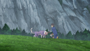 Luckily, Princess Connect has pretty much the best director possible for this, Takaomi Kanasaki of KONOSUBA fame. Sometimes the humor comes in the form of simple sight gags—like Pecorine turning around to notice Yuki, who she's been having a one-sided conversation with, is currently in the process of being mauled by low-level wolves (who likewise seem to be more than a little embarrassed at being caught in the act). Other times, the comedic sequences are more layered: one example is the scene where Karyl realizes that the meat she's just scarfed down comes from semi-intelligent monsters who have just showed up and are super pissed she ate their friend and while wearing his skin as a fashion accessory, which is followed by the reveal that these monsters' meat is poisonous, leaving our heroes covered in their own rainbow vomit as they lie paralyzed and powerless before the monsters. Finally, there are all the little jokes about the fact that Karyl is part cat—which, as a cat owner, I appreciate.