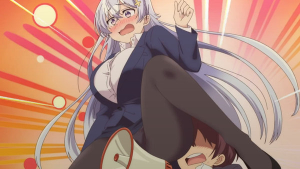 I believe we're supposed to feel protective towards her. She's earnestly trying her best and failing utterly. Abikura's desire to make her teaching life a little easier is our entry point into the story; we're meant to assume that we'd take on his role were we in the show. He's “rewarded” by glimpses of her breasts (tastefully covered by her bra, of course), her bare butt, and her falling up against or on top of him. The problem is that she's humiliated by all of these things, so it just ends up feeling mean. By the time we hit the late-episode joke of her falling on her megaphone and then on top of him in such a way that when he speaks, the megaphone vibrates against her clitoris, the whole thing just feels kind of gross.