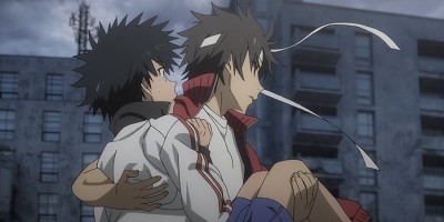 For a long time my favorite scene from the entire A Certain Magical Index franchise has probably been the second bridge confrontation between Touma and Mikoto, the one that happens during the Sisters arc in both A Certain Magical Index and A Certain Scientific Railgun S. Episode 11 of this series has given me pause to reconsider, however, because it has one scene in it which so inverts the norm for the franchise that it has to be considered: Sogiita cradling Touma (whom he has just caught after the latter was sent flying) in a princess hold. I doubt that shot will get old anytime soon.