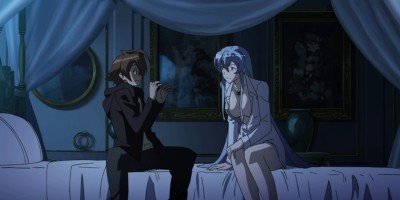 I should have known better. This show's jokes tend to have hateful punchlines, and it becomes clear that this one is no different when Tatsumi ends up in Esdeath's bedroom. The creepy voyeuristic nature of the situation cannot be overstated; Esdeath isn't wearing much, the camera is all over her, and she's all over Tatsumi. This atmosphere makes it difficult to take anything that happens in the scene seriously. In fairness, I'm not sure that I would have anyway. Tatsumi attempts to convince Esdeath to abandon the Imperial Army and fight for the good of the people, and Esdeath's response is an “only the strong survive and the people who die are weak” speech: a pitifully uninspired regurgitation of something dozens of more interesting villains have said in dozens of better ways. The scene manages to trivialize both sides of Esdeath, highlighting the cardboard cutout nature of her ideals and making queasy fanservice fodder out of her inexplicable “love” for Tatsumi. It's a quintessential Akame ga KILL! moment, a patented blend of shonen cliches and warped puerile morality that steps on its own feet like clockwork.