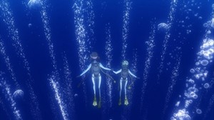 For the open water portion of Futaba's certification exam, Katori-sensei takes the group to Osezaki, which she describes as a mecca for rookie divers. No longer plagued by her character-defining self-doubt, Teko wastes no time in suiting up and expertly performing the standard safety checks. Aside from a few minor slipups, Futaba manages to pass the final stage of her exam with flying colors. Even her once-dreaded mask-clearing exercise can now be performed with confidence and finesse. After receiving her temporary Open Water Diver license (the real one will be ready in the near future), Futaba reflects on her recent accomplishments alongside Hikari, who admits to being a little too forceful in the early days of their friendship. However, Teko says that she's grateful for all that pushiness, since it enabled her to discover the world of diving and build lasting friendships.