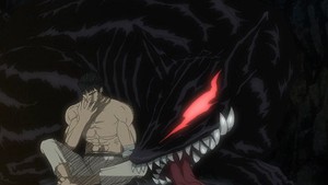 On the very small plus side, if you were going to smush a wad of character-development-based-catchup-recap into the show, this is certainly the place to do it. Godo's cottage is the only safe haven Guts has in the world, and when Godo inevitably passes away, even that will be taken from him. The God Hand's brand has made him forcibly nocturnal, but this may be one of the only nights Guts won't have to spend fighting for his life, leaving him alone with his darkest thoughts. (Even if we don't have literal demons hunting us every night, haven't we all been there?) Unfortunately for the audience, this means a truckload of truly poignant deconstruction of Guts's character getting abruptly crammed into too little time, alongside Underwhelming Depiction of the Eclipse #3,621.