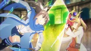 It's here that this episode of BOFURI sees fit to deploy the more pragmatic ‘full gamers’ like Sally to deal with elements like Frederica's electronic espionage. Maple, being the PVP-averse type she is, isn't even familiar with NWO's ‘Duel’ function, while Sally is all too ready to use it to put vital information on the line in a space enclosed from her impossibly-powerful innocent girlfriend. The series nearly regards Maple's overpowered monster comp-stomping and competitive player combat as different worlds, exemplified by the sheer tonal shift when we see Sally and Frederica fighting here. Sally's fight scenes have always tended towards a more serious edge, but it's especially apparent coming off the wooly puff-ball and ridiculous robot antics of last episode, with this section featuring nary a cute reaction face or clumsy stumble into success. It's all serious strategy and metagames, and while that might reflexively make some tune out since that's not the kind of content that's traditionally made BOFURI its most enjoyable, it's still worth sticking with since they know how to dress it up in the same kind of outside-the-box approach Maple and her friends have lent to the show as a key charm.
