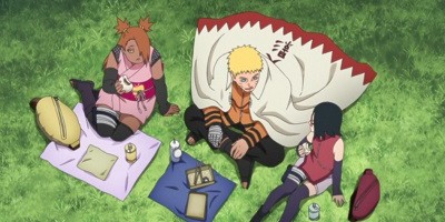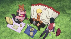 In the preceding feature film and monthly manga (both of which are set several years in the future), Sarada looks up to Naruto and wishes to follow in his footsteps as Hokage. Since these two characters never had any extended interactions prior to this arc in the anime, perhaps this marks the origin of her admiration for Naruto. Sarada's high opinion of Naruto presents an interesting contrast to Boruto's tsundere-like disdain for him. Furthermore, in light of what the audience knows about Naruto's childhood, Sarada's view of him is starkly at odds with many of his goofier qualities. Perhaps to underscore this, shades of the old Naruto shine through when he tells the girls that he was every bit as proficient in ninjutsu and popular with girls as Sasuke during their Academy days. In this time period, Naruto is widely viewed as the best shinobi of his time, but it's refreshing to see that he's still the same person at heart.