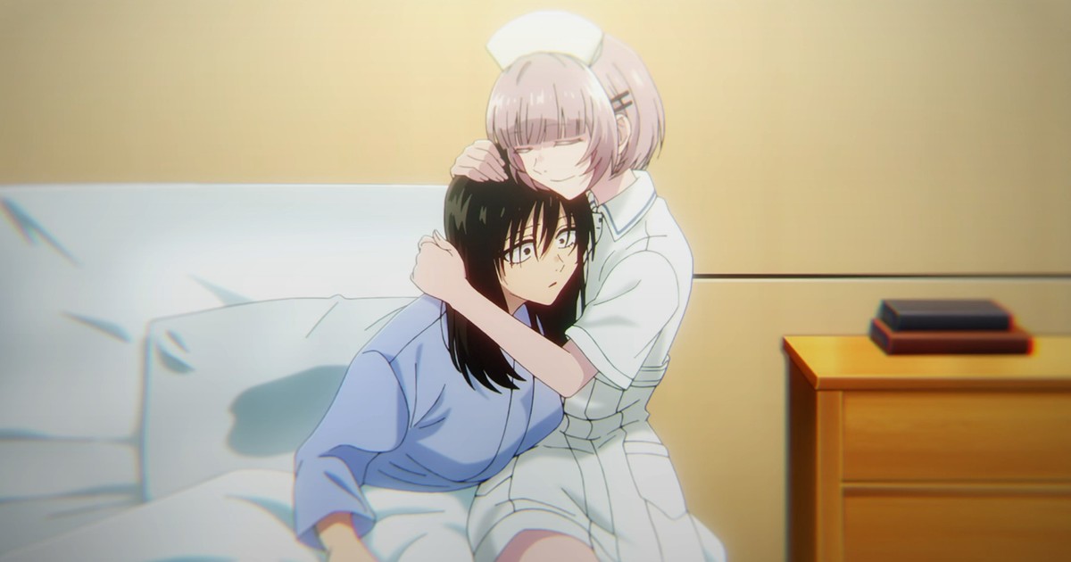 When Kabura walks to the roof in an angry, resentful, and self-destructive state, Haru appears before her. That's a good metaphor for their relationship, in which Haru has been the sole supportive presence that we've seen. Although she's a nurse, Haru goes above and beyond the call of duty. She peels and cuts an apple, jokes around, and speaks her mind. She bathes both sides of Kabura. The sexual connotations of the fruit sharing and sponge bath are especially loud, and Kabura's desires come crashing down around her like a torrential thunderstorm on that rooftop. Kabura, simultaneously confused and sure of herself, confesses her love to Haru, who had known for a long time. Unlike every other person in her life, Haru assuages Kabura's self-deprecation and accepts her. Bathed in the glow of a blood moon, Kabura accepts herself as well, turning into a vampire who, by nature, is a monster, a freak, and a deviant. And with Haru's helpful and loving seduction, Kabura embraces the freedom that comes with that territory.