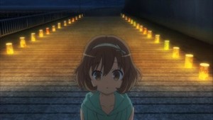 The main plot this time is that Nonoka, in an effort to make things up to the relentlessly angry Yuzuki, is going to try to have fireworks over the lake. She starts making that plan when she finds a picture of herself with her mother from seven years ago, at the festival against a backdrop of fireworks. Koharu offers to help, and Nonoka spreads the word that this is going to happen. Whether it does or not largely hinges on Noel, of course – she is, after all, the saucer, and that's what's been gumming up the works for the last seven years. In a cynical moment before the episode starts to move, one might ask oneself, “So why doesn't Nonoka just ask Noel if she minds fireworks?” A reasonable question...until you find out that Noel has no idea what fireworks are. And really, why would she? There haven't been any since she arrived. But Noel is nothing if not determined to do right by her friends, a fact that this episode does a beautiful job of both showing and telling. The former isn't terribly subtle – she flat out states to Yuzuki that she's happiest when the group is smiling. (The showing at the end is much more remarkable.) Those words (and Nonoka's photo album) are what Yuzuki needs to finally get over the hurt she's been nursing for so long, and we do get a clearer idea of why she's so angry. The loss of the fireworks led her to run away one night, which resulted in Souta hurting himself. It's easier for Yuzuki to blame the saucer for her brother's broken leg than to blame herself. Immature, yes, but fairly consistent for the age that she was and is, and we do get to see her finally face facts and grow up a little. I also have to wonder if looking at the picture of Nonoka and her mother made her realize that while she lost the festival and got her brother injured, Nonoka's mother actually died, making her grudge pale in comparison.