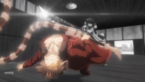 Pacing aside, there's a fair amount going for the story this week. Ikki seems to have buried the hatchet as far as Ayase's cheating in her match against him goes, although there's a definite feeling that he did so mostly so that he'd have an excuse to fight the Sword Eater, a particularly skilled and cruel knight student from another school. This actually makes him more likable as a character, as it gives him something more to his personality than “Mr. Nice Guy who helps girls.” By using Ayase's tragedy to finagle a fight with his desired opponent, Ikki gets to look good while also satisfying his more selfish urge, giving him a more human quality that he really does need. We can see that he's really having a great time during the fight, using his mind and body in tandem to counter his opponent's overpowered attacks while still clearly holding back himself in order to pull out all the stops at the last minute. The ruined dojo setting gives this fight an edge over the formal competitions as well, since we know that no one is going to hold the boys to the rules. This is a real test of Ikki's prowess.