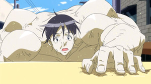 Concrete Revolutio leads you to believe that the plot about the escaped convicts is the A-plot of the episode. After all, it's established that these blue monsters are half-Devila, the race of subterranean creatures who were the focus of last week's episode. The main characters continue to discuss the problems with these escaped convicts throughout the episode, but that plot gradually fades away to re-focus on the real story, which is about Wakamura, and his daughter, and his newfound Human Man powers. Throughout the episode, he confronts various different forces in his world to try to decide what to do with his new abilities.