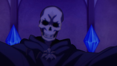 To the episode's credit, this is probably the best its action has ever looked animation wise, but it's still pretty rough to watch. The editing and direction is choppy throughout the episode; most of the decently animated shots either cut away too quickly or are framed too haphazardly to be appreciated. There are some very ugly shots that make their way into the production too, with several cuts of charging homunculi that look flat-out unfinished. To make matters worse, nearly every sequence up until the epilogue is bathed in an obfuscating blue tint that makes things hard to decipher. The series' signature fuzzy filter is present at its worst too; I'm baffled as to why this smeary Vaseline effect is relied on so heavily. (Maybe to try and replicate a kind of depth-of-field effect?). It remains unfortunate that such a hideous visual effect is one of Death March's only unique signifiers.After incapacitating the homunculi, Satou goes up against Zen, and the fight is exactly what you would expect from this kind of series. Satou is basically invincible, so there's no tension or excitement to be had in seeing him do battle with anything; there's no need for creativity, skill, or surprise in any of these combat encounters, so Satou's battle with the undead king is no different from any other fight he's had over the course of the season. The show tries to make the encounter worthwhile by having Zen monologue about his tragic backstory, but it's too trite to inspire any sympathy or intrigue. The only mildly compelling point to be found is Zen's mention of having died and been reborn into his role, similar to Arisa, though it isn't clear if Zen came from another world or just lived multiple lives in this one.