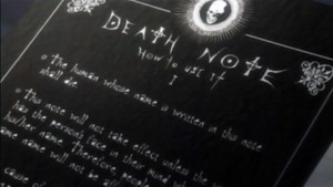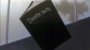Death Note. In Japanese, the word for notebook is "nooto" (pronounced nor-toh) which is where the English title has derived the word "Note" from. As one may have now deduced, the title refers to a "death notebook" in which if a person's name is written, they will die. This notebook initially belonged to the realm of the Gods of Death, or Shinigami. All Shinigami possess one, in order to take human lives before their time to die in order to add the difference in years to their own lifespan. Thus, a Shinigami's existence relies heavily on the death of humans. However, one Shinigami- Ryuk is tired of his world. It is barren and desolate, with little to do, eat or see. So Ryuk obtains a second Death Note by tricking an elder and "accidentally" drops it into the human world. Out of boredom, Ryuk starts off one of the most memorable stories in anime. When the lucky Light Yagami finds the Death Note in his school, he thought it was some twisted prank. Ryuk had even written the rules of the Death Note inside in English- the most common language in the world today. Light, being a Japanese prodigy is fluent in English and sees the first rule of the Death Note- "The human whose name is written in this note shall die." Intrigued by it, Light sneaks the notebook into his bedroom and writes the name of a criminal who was being broadcasted live on television. The second rule of the Death Note was "This note will not take effect unless the writer has the subject's face in their mind when writing his/her name. Therefore, people sharing the same name will not be affected." The news program had displayed a photograph of the criminal on screen which allowed Light to know specifically who he was dealing with. The interesting part is when the rules begin to explain the causes of death: