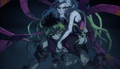 Then there's the way that “Transformation" handles Daki's character, which…okay, on paper, I really dig the idea of an emaciated murder brother that just creeps up out of Daki's flesh. That's just the sort of generally neat, gross, and weird dose of body horror that I love to see in my action anime. What I don't like is how Daki's brother comes out after Uzui shows up and basically negs Daki into submission, causing her decapitated head to thrash about in a childish tantrum until Gyutaro comes out. Then, Gyutaro proceeds to insult and belittle Daki more, even as he threatens Uzui with an imminent disemboweling courtesy of his gnarly sickles.