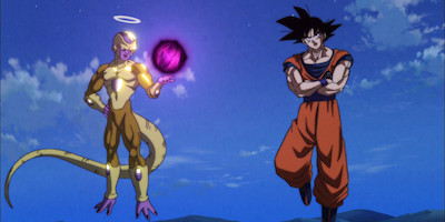 The bargain falls through just as Beerus and Whis arrive and help Goku out. The group ultimately decides on a "friendly" sparring match between Goku and Frieza, with the winner getting to do things on their terms. As of this moment, we're inside Frieza's internal monologue enough that we know A.) he's confident enough in his strength and familiarity with Goku's moves to believe he'll win (the match is over when someone lands the first punch) and B.) he seems so determined to be evil that even if he loses he probably won't entertain Goku's terms anyway. What follows is a beautifully animated and fast-paced match that ends with them exploding each other's faces with simultaneous punches. When they both knock each other out, our understanding of Frieza's position of power evaporates on the spot. It's hard to think Frieza's ego will remain intact after we see him and Goku passed out together with mutually swollen faces.