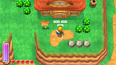 It's been more than two decades, so it might be hard to remember how Zelda games used to throw you into a nearly open world. Link to the Past -- like the original Legend of Zelda and its contemporary, Metroid -- was about a sprawling map waiting to be explored, where the pegs that needed hammering and the rivers that needed fording cut off single screens, not entire areas. Console-released Zeldas, on the other hand, have been refining a different script for the past fifteen years. From Ocarina of Time onward the dialogue has become more verbose, the tutorials more endless, and the structure more rigid: get this thing, go to the Fire Dungeon, get this next thing, proceed immediately to the Water Dungeon. This game cleaves far more to the older style of Zelda than the new. The design derives almost entirely from the adventure games of the NES and SNES, only barely informed by Ocarina and beyond. But the similarities go beyond mechanics, Link Between Worlds is a direct sequel to Link to the Past, set in the same world, with the same map. If you know where Death Mountain is in Link to the Past, you know where it is in Link Between Worlds. If you remember where they put the bottles in that game, you have a good headstart on where they put the bottles in this one. The barriers to progression are often in the same places, the heart containers usually are too.
