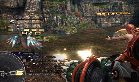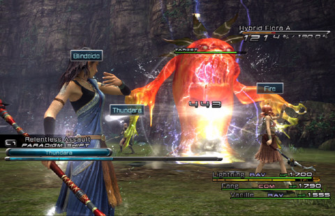 The game's six playable characters similarly divide their appeal: Snow and Hope are insufferable despite the best efforts of their voice actors, and Vanille and Lightning are initially unsympathetic. Vanille's constant attempts at comedy are awkward, and Lightning's far too distant and cold, as though the writers were so intent on creating a tough, competent heroine that they forgot to make her at all compelling. Sazh, who many expected to be a comical and borderline-offensive stereotype, comes off the best, as he's an older, wearier voice in a cast of headstrong kids. There's also the likeably brusque Fang, though she's the last of the characters to join. It'd be easier to endure Final Fantasy XIII's dismal crawl of a plot if the battle system picked up sooner. The game pares down the menu-driven system of a typical Final Fantasy, letting players control only the party's leader through commands. The other two members run on automatic during battle, and the entire group is governed by the “Paradigm Shift” system. Teams are formed with each character in a designated role: Commandos and Ravagers attack, Medics heal, Synergists and Saboteurs cast weakening or strengthening magic, and so on. It seems needlessly cumbersome at first: instead of picking battle directions from one large menu system, players have to switch between Paradigms if they want to do something as simple as healing before attacking.