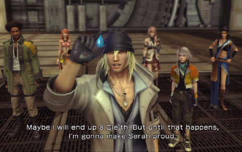 Final Fantasy changes. It might look like a stagnant series, with each game starring glamorous young heroes distinguished only by their improbable hairstyles and penchants for melodrama. Yet every Final Fantasy also tries new things, usually altering just enough in gameplay and storytelling to alienate some longtime fans. And that's kept the series remarkably fresh for something with over a dozen proper entries. Final Fantasy XIII is an experiment in some ways and a throwback in others, streamlining combat while indulging in the glitzy theatrics that made Final Fantasy what it is today. It's also a test of just how much bland introduction a player can take. Final Fantasy XIII borrows a common sight from the anime/RPG milieu: a massive city called Cocoon floats above a savage wilderness called Pulse, and both lands are governed by powerful beings called fal'Cie (get it?). These seemingly callous deities mark humans as their servants, branding them as l'Cie and putting them to use in dangerous and vaguely understood wars. When a fragile young woman named Serah is deemed a l'Cie and dragged off to Cocoon, her sister Lightning chases after her, with largely unwanted help from Serah's moronic fiancé Snow and his band of rebels. Snow and Lightning soon become l'Cie themselves, as do others connected to them: the muffiny-haired pilot Sazh is searching for his Cocoon-abducted son, the gloomy kid Hope's mother died fighting beside Snow, and the relentlessly upbeat Vanille is apparently just tagging along. And then there's Fang, a dedicated spearfighter who shares Vanille's strange background and Australian accent. Every Final Fantasy needs some time to get going. The first few hours typically see the player fighting some tutorial-heavy battles, meeting the lead characters, and learning about the world around them. There is a point, however, where the storyline kicks into gear, a full party is assembled, and the game gives the chance to explore and customize freely. In most Final Fantasies, this point comes around the three-hour mark. Final Fantasy XIII takes 15 hours to get interesting. Fifteen. During this astoundingly long setup, the characters trek through the outskirts of their civilized world with the Cocoon military pressing close behind. The group splits into pairs: Hope follows the determined Lightning, Sazh learns to tolerate Vanille's insipid ways, and Snow and Fang work for a shadowy benefactor. They resolve some predictable conflicts, have a few minor breakthroughs, and generally don't do much more than establish the world and narrate flashbacks to happier times. Meanwhile, the Cocoon forces remain a vague threat, driven to keep the peace by exterminating anyone infected by the land of Pulse.