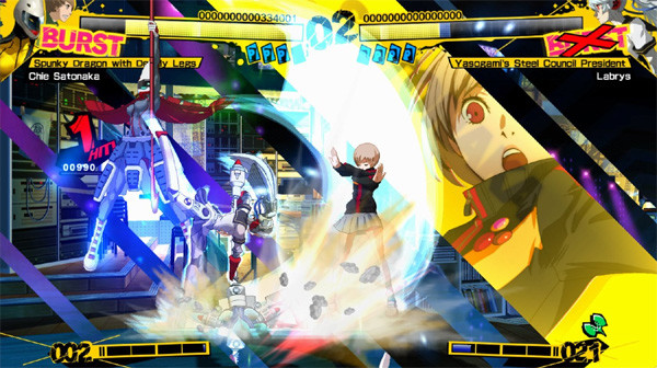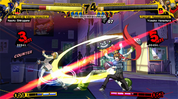 There's something unnatural about Persona 4 Arena. The original Persona 4 was a gentle-paced RPG where social calendars and lazy afternoons mattered almost as much as the twisted labyrinths and demonic undercurrents. Persona 4 Arena is a fighting game, built upon the quick, brutish fix of bashing an enemy unconscious in three minutes' time. And it's made by Arc System Works, the outfit behind the utterly chaotic Guilty Gear and BlazBlue. Yet that's appropriate for the Persona series, where characters often hide dark and troubling doppelgangers. Arena may be a violent cash-in, but it's undoubtedly a part of Persona 4. Arena returns the game's formerly reticent protagonist to the bucolic town of Inaba. No longer a silent vessel for the player's input, our hero has the canon name of Yu Narukami and some larval signs of a personality. He's not the only guest coming back, either. The town also sees the resurgence of the Midnight Channel, the same mysterious TV station that turned characters' insecurities into horrific mazes throughout Persona 4. This time, however, the network's broadcasting promos for a fighting tournament starring Yu and his friends. Before long, Yu gathers up his fellow Mystery-Solving Teens: martial-arts nut Chie Satanoka, perpetual screw-up Yosuke Hanamura, and elegant goofball Yukiko Amagi. The channel soon draws in Persona 4's other faces, including sensitive punk Kanji Tatsumi, uptight detective Naoto Shirogane, and the cuddly, pun-spewing creature called Teddie. It also gathers Persona 3's Mitsuru Kirijo, Akihiro Sanada, Aigis, and Elizabeth. And then there's a robot named Labrys, who seems to be at the center of the Midnight Channel's mocked-up reality. Arena's careful to capture the Persona 4 cast in all their foibles, and it's just as careful to present a fighting game accessible to new players. Squaring off in standard 2-D fighter stages, characters have four buttons for attacking. Two deliver weak and strong blows, while the other two control a summoned Persona: a towering, grotesque spirit-creature that somehow symbolizers its user. All of the moves are performed with basic motions, and it's almost too easy to pull off a damaging, screen-filling combo. Simply holding forward and slamming the weaker attack button will unleash a series of strikes followed by a special move and, if a meter's built up, a flashy super attack. That's a bit much. Yet this isn't a simple fighting game by any means. Arena's matches rely on all sorts of techniques: Guard Cancels that counterattack, low-level sweeps, rising attacks that drain your life meter, Burst moves that hurl your opponent across the screen, short jumps, aerial turnarounds, instant-kills, and an All Out!! Attack that imitates Persona 4's big cloud of cartoon brawling. And you'll have to consider all of these while watching four different meters: your life bar, your Burst gauge, your SP percentage, and your Persona's hit count. It's the Persona creatures that truly set Arena apart. They vary bizarrely in appearance and fighting style, but they'll all materialize and attack at the touch of a button. Their moves are usually a shade slower and more powerful than the strikes of mere humanoids, and they're not invincible. A Persona can take five hits before it's knocked out of commission for a few precious seconds, leaving you with a paltry two-button repertoire to defend yourself. You're running two characters at once in Arena, and the resulting strategies work your reptilian fighting-game brain in ways that the rest of the genre usually doesn't (except for CAPCOM's conveniently reissued JoJo's Bizarre Adventure). It's a refreshing idea.