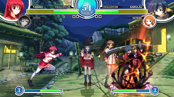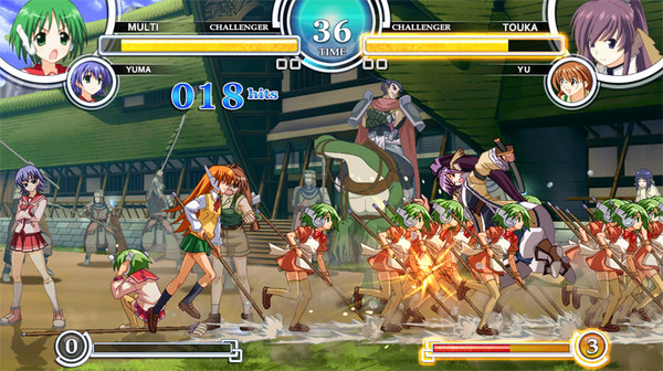Aquapazza inspires low expectations. It looted its cast from the Aquaplus and Leaf catalog of visual novels, RPGs, and dating sims, all with narrow cadres of fans. It seems a fighting game made exclusively for those who follow Aquaplus creations, those who spent hours courting Tamaki Kousaka in To Heart 2 and yet more time unspooling the elaborate backstories of Utawarerumono. This suggests a simple and unmemorable thing, an over-sweetened confection that presents little gameplay depth while established fans button-jab their way through a storyline. That would be completely wrong. In fact, Aquapazza is anything but simple. The crossovers bloom rapidly in Aquapazza. An ineptly brewed love potion bursts dimensional seams and draws in schoolgirls from To Heart, tribal beast-folk from Utawarerumono, a gamut of fantasy archetypes from Tears to Tiara, and a smattering from Routes, Comic Party, Kizuato, and White Album. Their inevitable fights play out with a flourish; the characters are crisp, subtly well-animated sprites unleashing attacks that fill the screen with explosions, fireworks, and other glowing excess. The backgrounds are detailed pickings from the various series, with high-school backdrops, concert halls of waving cell phones, and a feast where a giant crab looks rather chipper about being boiled alive. All of this is backed by an upbeat soundtrack and constant exclamations from the combatants.