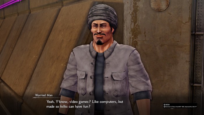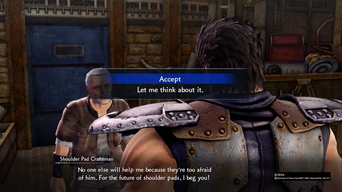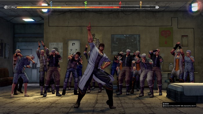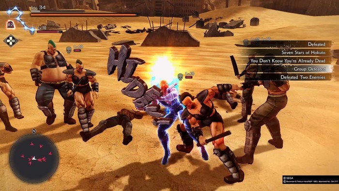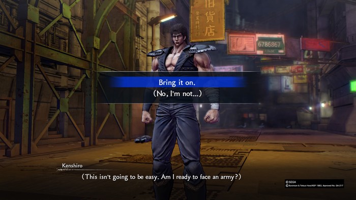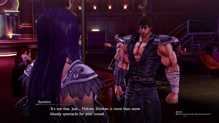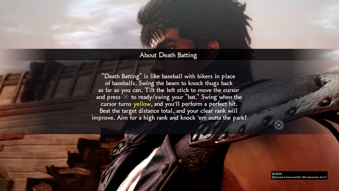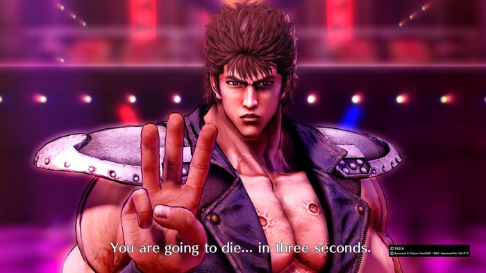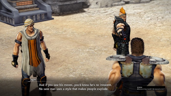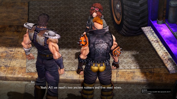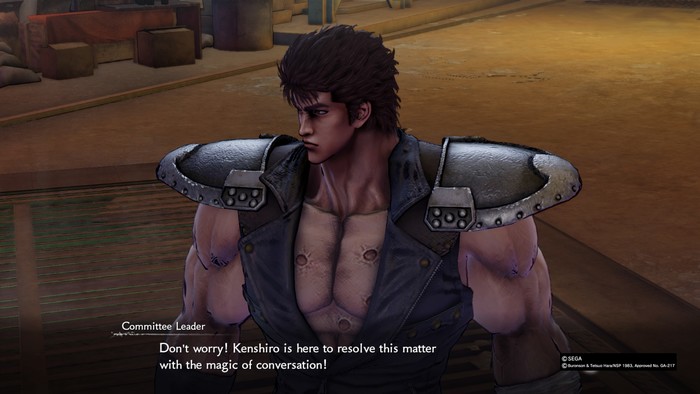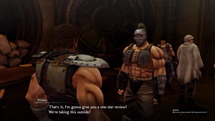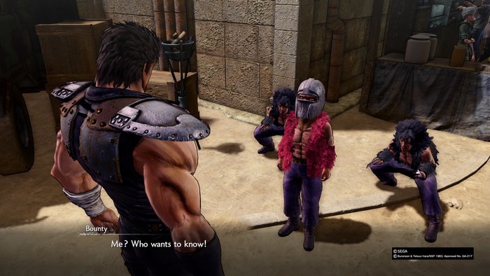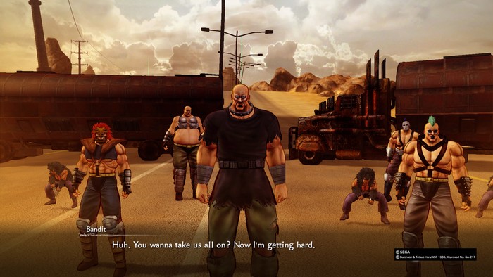 The last few years have marked a surge in popularity among English-language fans of both Sega's long-running Yakuza series of videogames as well as—to a lesser extent—the formative trope-establishing Shonen Jump fighting action series of the early 1980s, Fist of the North Star. For years, both were stymied from finding an audience in the West, but all either ever needed were spiritually faithful localizations without massive edits and both physical and digital distribution so that fans could see the dang things and realize that there was far more to either than their blood-drenched, musclebound exteriors suggested. In 2018, thanks to the wonders of memetic humor, even teenage fans know Kenshiro's signature catchphrase “omae wa mou shindeiru” (“you are already dead”). Granted, whether they know that's a Fist of the North Star thing or just know to shout back “NANI?!” in Fortnite chat is another story, but it is in this zeitgeist which Lost Paradise resides. The main thing you should know about Lost Paradise is that it's a game for Fist of the North Star fans who want to experience Yakuza which is marketed as a game for Yakuza fans who wish to experience Fist of the North Star, the latter describing most potential players in America. Despite being an original and completely self-contained story primarily focused on brand-new allies and enemies, its reshuffling of events and characters from the original story seems to assume players can immediately grasp that “this time, things will happen THIS way instead!” Powerful abilities with lengthy cooldowns are associated with “key characters,” some of whom may not necessarily even be in the game. That's not to say there isn't enjoyment to be found if you're primarily a Yakuza fanatic. The open-world formula of traditional Yakuza games primarily revolves around one key area in which delinquent elements and civilians alike intermingle, providing the player with a myriad of optional diversionary tasks and gradual upgrades as they progress through a story that guides them through every corner. That approach is replicated here, in a new location for those who've practically memorized the layout of Kamurocho at this point. I don't want to spoil the core story, but in search of his beloved Yuria, Kenshiro encounters an oasis in the wasteland: the walled city of Eden where food, water, shelter, and even electricity remains plentiful. (The neon makes things much more colorful at night, if its day visuals are too brown and grey to your tastes.) The walls are quickly breached, however, and so you end up with roided-up brutes sporting dyed mohawks, face paint, S&M gear, and medieval weaponry milling about right alongside common civilians and merchants to provide random encounters for you to contend with a la Yakuza. Eden is the hub through which most of the game takes place, though it's not long before you acquire a buggy with which to explore its surroundings. Yes, it's a mostly barren wasteland, but as the narrative progresses you acquire various terrain-clearing upgrades. Such a thing could easily become tedious, but thankfully Lost Paradise not only permits you to fast travel between previously visited points, you get to listen to classic Sega tunes while doing so. Time flies when you're listening to Outrun's Magical Sound Shower or the jungle theme to Super Monkey Ball just before you absentmindedly run into a roving bandit horde that's significantly larger than those you'd encounter in Eden. Fortunately, numbers are of little concern to one who can make bodies explode with a touch. Like the best superhero videogames, your victory is practically guaranteed and it's simply a matter of how stylishly you'll prevail. Lost Paradise employs a system of light and chargeable heavy attacks which open up your opponents to a variety of secret techniques capable of instant kills. Do it just right, and baddies emit a comic art-style death cry speech balloon which can either restore health, charge up your Burst meter, or manifest as a physical object for you to then bludgeon the remaining enemies with. The Dragon of Dojima (optional character skin, BTW) is cool and all, but Kenshiro gets to SMASH MANGA SOUND EFFECTS INTO PEOPLE, the two most important of which are bundled with the physical release as stickers. Activate the filled Burst Meter, and your jacket will tear off enabling you to perform additional enhanced attacks. (True to the source material, Ken's jacket will just magically reappear on him afterwards.) Variation in techniques does give a slightly greater experience reward, but you needn't grind random encounters; you're given bigger rewards for playing the quests. In fact, several of the best techniques only unlock by progressing the story and meeting key characters, so you stand no risk of inadvertently power-leveling beyond any challenge the core narrative presents thanks to exploration (aka the “Bethesda Studios Effect”). The fighting system isn't quite perfect, though. I frequently lock on to absolutely nothing, resulting in me punching air and getting smacked in the back for facing the wrong direction. Even after upgrades, the evasion side-step travels quite a short distance and charged heavy attacks are just a bit slow, which can make contending with enemies that block or use blades a bit of a pain. The timing window for parries and counters is rather short, and what's more, some context dependent techniques use the same input as basic ones. If I press Triangle while near a stunned opponent, will I spin them in circles and throw them for crowd control, or will I just do a roundhouse kick? Different enemy types are susceptible to different attacks, so it helps to learn the system mechanics rather than just mashing…but you can still do reasonably well just mashing, as the game gives you an abundance of recovery items (and eventually, abilities). The rough edges in the combat are ultimately minor; I relish in the opportunit
