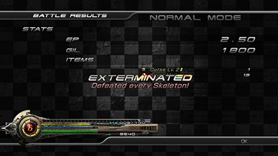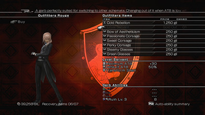 And time always feels like a factor, although you may learn it's not a particularly limiting one. Thirteen days is long enough to see everything Lightning Returns has to offer with time to spare, since Lightning almost immediately gains access Chronostasis, an ability that lets her freeze time. Chronostasis costs EP (better described as "Limit Break"), which can only be restored through fighting battles or by using exceptionally rare Ethers, but it's not a very expensive ability. Some fights restore twice the cost of a single Chronostasis. Often these are fights against difficult enemies, so the EP feels better spent on eking out a win, but puzzle-solving skills and quick fingers lead to effective victories more often than just spamming limit breaks. After a few days, many of the random battles will become routine, and Lightning will have ways to near-infinitely freeze the clock. Chronostasis feels like an necessary ability, but a poorly balanced one. When there is a quest turn-in it that's absolutely required at 11:30, and you're halfway across the map at 11:15, Chronostasis is a godsend. When you're using it at the end of every random battle as a matter of course, it feels like it should've been astronomically more expensive. There is no leveling. Combat rewards no experience. Instead, Lightning increases her stats by fulfilling tasks. Every job, no matter how humble, offers an increase of hit points, strength, or magic; some of the really important ones give her greater capacity for healing items or limit breaks; and, in keeping with the game's obsession with clothes and customization, and even the most trifling request gives Lightning some aesthetic trinket: aviator sunglasses, or a pink knapsack, or a hair ribbon, or a tattoo. Many of them are ridiculous -- Groucho Marx-style glasses, dunce caps -- and the game revels in this. Or, anyway, it doesn't seem to mind a bit of silliness; it certainly lets you walk into a very grave cutscene while wearing a pair of cat ears. Outfits follow a similarly irreverent tack. Over the course of the game Lightning gains access to the better part of fifty costumes. Many are blatant fan-service, as should almost be expected, given the developer's bizarrely specific comments on increasing Lightning's breast size. There are your Halloween-costume devil horns and tiny little bikinis, things that really only count as clothing in the most nominal way. But, almost shockingly, "scandalous" isn't the only wardrobe option. On offer are all sorts of things besides skimpy bikinis: trenchcoats, crushed-velvet suits, full plate, and another sort of fan-service. Lightning has access to not just the skimpy takes on Black and White Mage gear, but attire directly inspired by Cecil's Dark Knight, or Locke's Thief. With these referential costumes come powerful skills that convert regular abilities into iconic Final Fantasy moves, such as a Dragoon's Jump attack.