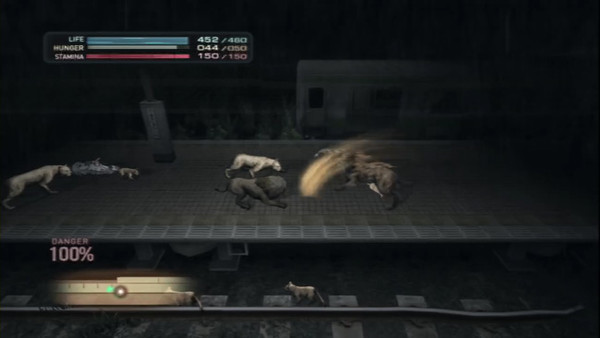 Beneath its dog-eat-dog skin, Tokyo Jungle is a roguelike with the standard trappings of randomly generated encounters and permanent death, but the actual play-style mimics Metal Gear stealth action, where you must hide in the grass to avoid the watchful eyes of more powerful animals, whose awareness of you is represented by "Danger!" and "Caution!" icons that numerically tick down as they lose interest. Its open world isn't very big and its graphics look closer to 2004 than 20XX, but its hard to hold these things against it because its concept is so charming. Tokyo Jungle's world has a Milo and Otis kind of wonder to it, where everything feels very large and very far away. Even after several playthroughs you may have only explored the Shibuya Station starting area (can we imagine the animals to be paying homage to their spirit beast, Hachiko?) and its immediate neighbors, while the most distant areas maintain an almost mythical character. The farthest areas, the Yamanote Line and Yoyogi Park, are reached only in the later years, when the world is almost completely subsumed by toxic fog, or the player's hunger meter is near-empty, or the path is nigh-impassable because of prowling leopards and lions. As you discover shortcuts through the sewers (to save time and hunger) and safe spots on building awnings (to hide from larger predators) the most distant places of the rather-small map lose some of their mystery, but never their allure, and each session begins with a renewed sense of purpose. Where the in-game challenge system issues edicts of "consume 2000 calories" or "change generations 2 times" these are to be completed only when convenient, as the internal goal of the player is always "go as far as I can, eat as much as I can, live as long as I can."