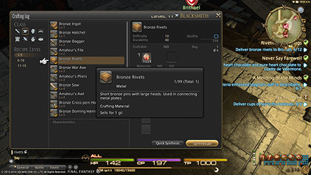 There's a certain feeling of "just do whatever" to it, especially with public quests popping up and disappearing all over the landscape, some of which team you up with thirty or forty real-life players to kill some obnoxiously large crab, who chucks you a crab pet of your own to hang out with after you've beat him. But this is not an open-world game's "just do whatever," whose gameplay loops feel like a insecure fairy sitting on your shoulder, nervously and ceaselessly questioning if you're bored, checking if you'd like to search for some treasure chests, or pick up some feathers, or race to the top of that building, or upgrade your knives, but none of these things seem to have any real overwhelming purpose to doing them, and none of these things are all that fun in the doing of them, either. Compared to the frequent drudgery of open-world games, Final Fantasy XIV's "do anything" ethos isn't some untold miracle of craft--repeatable quests are the genre's lifeblood, after all--it just actually bothers to inject some character into the doing of the thing. Maybe you want to craft iron frying pans, because this acorn-haired child-gnome-fairy named Bango Zango pays good money for them and he can't ever get enough. The game barely tells you why, it doesn't really care to. That this tiny pixie-man brokers trades for a (possibly) backalley kitchenware dealer is sufficiently unusual, and unusual frying pans are a better hook than Feather 37 (out of 100) Collected. There's rarely a light at the end of the tunnel, like if you gave Bango enough frying pans, like six dozen frying pans, there would be some achievement unlocked. Maybe there is an achievement unlocked, MMORPGs were about achievements before achievements before achievements were even invented, but if there is, the game does not go out of its way to mention it. It doesn't seem to feel the need to justify itself that way. Bango Zango is a Lalafell, which isn't a random selection of letters, but an actual character race you can actually play. You can build one of these strange cherubs and turn it into a Dragoon, the armor-clad spear-thrusters you remember from Final Fantasies IV and Tactics. If you want, you can then forge his tiny plate mail all by yourself. If you want, you can dye it a royal purple, or canary yellow, or fuchsia, too. Final Fantasy XIV has an endless supply of things to show you, and maybe only really big difference between this game and the rigorously bland checklist of open world affairs is that Final Fantasy is a lot more open about its silliness, and a lot less self-serious, and that makes it fun. Final Fantasy XIV has checklists, but its checklists are infused with an endearing (but kind of foolish) whimsy. Like a holiday event where Lightning shows up and stabs monsters for no good reason; like trekking to a remote desert town to buy blue cheese so you can make alligator salad; like leveling up your weaving profession so you can make pants for your mining profession so you can get ore for your goldsmithing professional so you can make a better needle for weaving. You can do that, if you want. You can also just buy that needle off of the auction house if you don't feel like making an Excel spreadsheet to plan your sewing career.