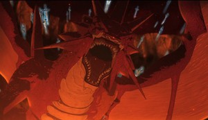 GATE excels here because it successfully generates a heavy degree of tension despite the viewer being reasonably sure that none of the main characters are going to buy the farm. (The cannon fodder dark elven warriors that are introduced early in the episode and trained to use RPGs? That's a different story. It would have probably been more surprising if any of them had come back.) The Fire Dragon is a menacing and lethal presence, and the directorial and animation effort fully brings out what it can do: devastating tail swipes, claws, burning victims alive, swallowing them whole, and just as importantly, a calculating eye which quickly evaluates the situation. Even in a more confined space it moves around, not remaining an easy target for the RPGs it is all too familiar with, and it is ruthless about going after those who harm it. Some great musical support through these scenes perfectly enhances the dramatic effect.