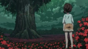 Mana gets a firsthand lesson in that when her great-aunt ends up in the hospital. She accompanies her mother to check on Toshiko, a spitfire of an old lady who asks Mana and her mom to check on the flowers at her house. Upon arrival, Mana is fascinated by the strange red hibiscus-like blooms, so much so that she sends Cat Girl a picture. Almost immediately Kitaro shows up, curious about the yoka plants, flowers which bloom around obon, a holiday honoring the dead. With Mana in tow, they trace the flowers to a remote Pacific island. A logging company is working there, plagued by strange sounds at night. As it turns out, they're the sounds of battle, stemming from the disturbance of the final resting place of the war dead.