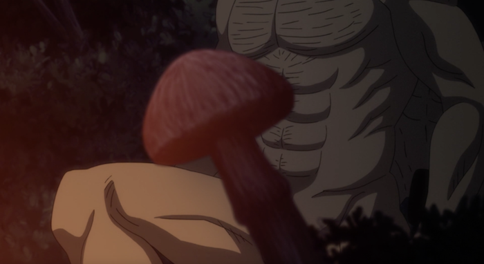 To learn more about them, the gang need to stop at an onsen first. This is where all the essential, Male Ass comes in. Big burly muscle men do absolutely nothing for me, but I'm sure this moment relaxing in the onsen is a treat for those who feel differently—like Satoru Noda himself. Regardless of whether the persistent rumors that he spent his long career gap in the world of gei comi are true, the influence of this genre over Noda's art in these sections is obvious. Gei comi, unlike yaoi or BL, is aimed specifically at gay men, so it tends to feature bulkier and hairier body types, rather than the lithe bishonen of boys-love. So all the attention paid to these guys' beefy muscles is par for the course. If things get to be too much, they can always rely on the series' old censorship standby of Shiraishi's face. In Tanigaki's case, we also get an incredibly unsubtle mushroom.