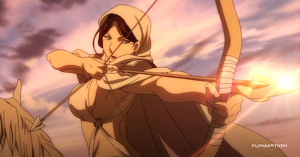 The last third of the episode adds another new player as we check in on Gieve. I was wondering when the archer woman was going to show up. She's prominent in the promotional art and the OP and ED, so I figured she was important. The Heroic Legend of Arslan desperately needed a female presence among all these puffed-up dudes. Farangis is perfect so far. She gives the chivalrous Gieve the cold shoulder, letting him know she can take care of herself, and intriguing him further. I'm interested in learning more about the religion she follows and how it fits into The Heroic Legend of Arslan's world. We haven't seen that much about what role religion plays in Parsian culture—or any culture other than Lusitania. I wonder what her beliefs are like and why she was seeking out Prince Arslan.