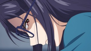 The fundamental disconnect in this episode arises because the writing and framing don't give Chizuru the same benefit of the doubt that Hiyori does. Once we're given access to her inner thoughts and private life, Chizuru looks and acts exclusively like a creepy stalker. She's drawn at low angles with flushed cheeks, wide eyes, and heavy breathing. She sighs dreamily at pictures pinned to her locker. She scribbles out Hiyori's face with a violent flourish of permanent marker. While I've celebrated Heroines embrace of clichés before, these are so shallow as to make the whole thing feel parodic. Maybe that's the intent, and it's the series' way of keeping this twist from being too much of a downer, but it doesn't mesh at all with Hiyori's more measured perspective.