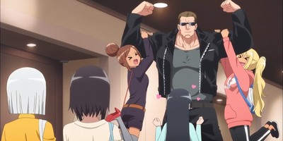 Barnold's charms are actually most effectively communicated by those two girls, already established in previous episodes as hardcore fans of his action-movie catalog. Hibiki and Ayaka's adorable fangirling over Barnie throughout this episode makes for some cute, entertaining atmosphere amongst all bodybuilding faux-drama he heralds. And he returns the favor by carrying them around or letting them hang off him in every other scene. Add in Akane really getting to flex her muscle-fetish thirst around all the musculature on display on men for a change for this show, and you get a real sense this episode of Dumbbells cutting loose and providing fanservice for itself this week. It works great, since the show has always been at its best when its enthusiasm was most infectious, and this is the most joyous it's seemed in weeks.