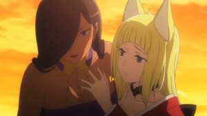 It also makes “threat of rape” the main weapon for this particular story arc, and I can't say that I'm wild about that. This is the second time Bell has been in danger of being assaulted by members of Ishtar Familia, and Phryne is a terrifying predator. At least the scene in Phryne's sex/torture dungeon isn't played for laughs like Bell's earlier experience with Aisha and the other Amazons. It's also followed up by a very sweet moment when Haruhime comes to rescue him and he hugs her while sobbing. Bell's trust in Haruhime, the fact that he turns to her for comfort, is a balm for both of them: Bell because he's traumatized and she's a safe person, and Haruhime because it means that Bell sees her as a person, one trustworthy and good enough that she can soothe him in his time of need. Given how she sees herself as tainted, Bell's trust and approbation go a long way towards her regaining some sense of self, although this episode makes it clear that she's still more than willing to just give into her fate as Ishtar's sacrifice rather than fight to live.