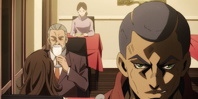 In reality, the monster-of-the-week fight ends up being only about half of this episode, with the other half segueing into our new villain squad. Formaggio is part of a hitman team associated with Passione, a group of gangsters who at one point went looking into the boss's identity and got a couple of their friends murdered as a result. We're introduced to this team through a flashback (and an uproarious scene where we get to witness Formaggio's Stand at its deadliest), and they form a bunch of wild character designs, which means we're going to be fighting a fair number of these guys as they try to intercept Trish.