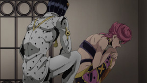 This episode declares itself as Team Bucciarati's "final" mission from the boss. Bruno is tasked with escorting Trish through the final step, and the rest of the crew have to wait outside per the boss's meticulous orders. Giorno and Bruno have a moment before they split, and I realized I had completely forgotten how this entire story even began. I had gotten so used to thinking of Bruno as the leader that his desire to help Giorno usurp the boss feels out of place now. Regardless, Bruno's a good dude, and the quiet moments of solidarity he gets to spend with Trish are incredible. Trish is normally emotionally closed-off, but she's really sweating this encounter.