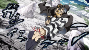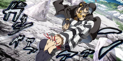 This is a great-looking episode from beginning to end. JoJo's character designs have been gradually becoming more lithe as the franchise goes on, and it's fascinating to see how that impacts the series' famous "JoJo posing". An episode like this is an opportunity to take that flamboyant idiosyncrasy and make it intrinsic to the art's expression. These men are drawn so beautiful and attractive as they gnash each other's guts out like pigs, and the downright fetishistic violence becomes part of the episode's impact. There's so much warmth radiating from the little details, like the meticulously animated body language and Doppio's blindingly pink hair, that I almost forget to even notice the blood and gore.