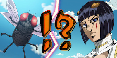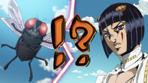 The solution ends up being something about the Stand deflating an identical looking boat and using it as a cover for the actual boat, allowing the Stand user to hide his hostages between the layers. But what was up with the fly?! It was Narancia's shoe from last episode that Giorno transformed, but here it's being used as a visual placeholder for the villain's disembodied voice. It's honestly stupid and confusing, especially since you're still in the process of figuring out the enemy Stand's ability while the show is throwing all this extra information at you.