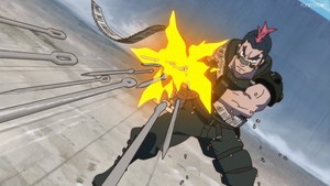 For all my griping about the dip in art quality in episode 4, the fifth episode of Kill la Kill gets immediately back on track. It's obligated to, because they're introducing a new recurring character: Tsumugu Kinagase, whom I remembered liking quite a bit and was immediately reminded of why. Clothes are the ultimate weapons and, with the exception of Senketsu, the power of the enemy in the world of Kill la Kill, so here we have Tsumugu, a clothes-hunting antifa (that is, “Anti-Fashion”) operative who brings a whole new meaning to the term “going commando." His visual gimmicks are great, fighting as he does with a sewing-machine-gun that fires special needles and dropping spool-shaped bombs. It's that fusion of ridiculous-yet-awesome that Trigger has had on display since this show's heroine started swinging a giant scissor around. He takes on the Honnouji Gardening Club in the cold open showcasing an amazing battle of sewing versus sowing, and this episode never really lets up from there.