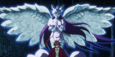 Carpaccio's capabilities are wholly the result of his super-special wand manifesting the giant angel nurse stand thing that protects him. I'd have presumed the fight would boil down to simply getting his wand away, but then, Mash's approaches have always been nothing if not unconventional. Mash can instead simply find a limit to Carpaccio's powers where he never thought that there might be one—appropriate, given his abilities were an unmoving, undeveloped gift he's depended on since birth. It pushes things into that kind of fist-pumping "Hell yeah" territory that's honestly way more satisfying than just knocking Carpaccio's wand away would have been.
